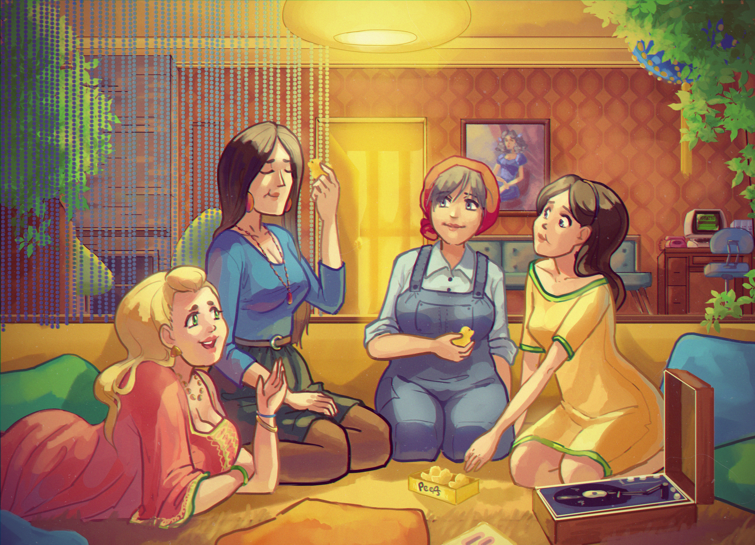 Awhile back cptlfrghtr asked for a drawing of OS/360-tan (second from left) and OS/ES-tan (Soviet clone of OS/360, pictured here at the far right) eating a box of marshmallow Peeps together. Because his birthday was coming up I decided to go all-out and include MTS-tan (far left) and DOS/ES-tan (Soviet clone of DOS/360, second from right) as well, because the more mainframes the merrier! (Technically there's a fifth here — points to whoever can figure out who she is.)