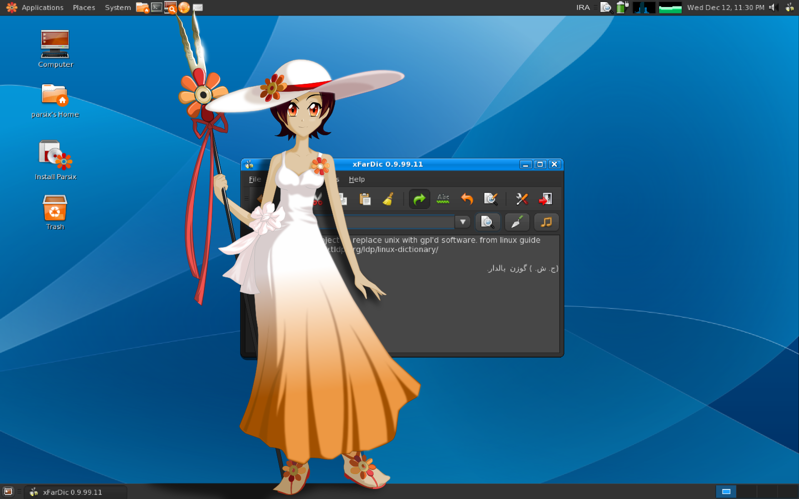 This image of Parsix-tan was a collaboration between ~siya and ~C-quel. The OS represented is Parsix, a Debian GNU/Linux based distro which hails from Iran. Parsix-tan incorporates some ancient Persian themes, most apparent in the spear she holds, as well as references to her namesake OS.