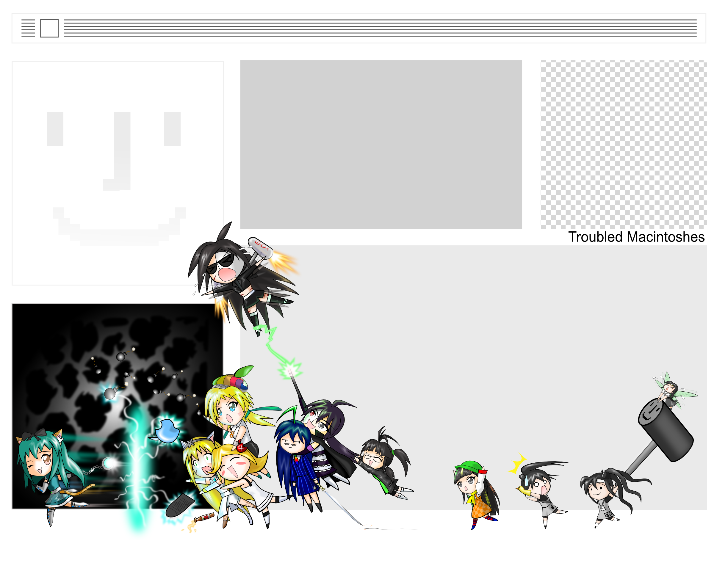 The wallpaper is a parody of the "Trouble Windows" wallpapers that popped up at +Niijura+ at around that time, and features Mac Systems 1 through 8, Apple Newton-tan, Mac OSX Server Rhapsody-tan and Mactel-tan being bested in the race by Mac OSX 10.6 Leopard-tan (even though she's clearly cheating). ^___^'